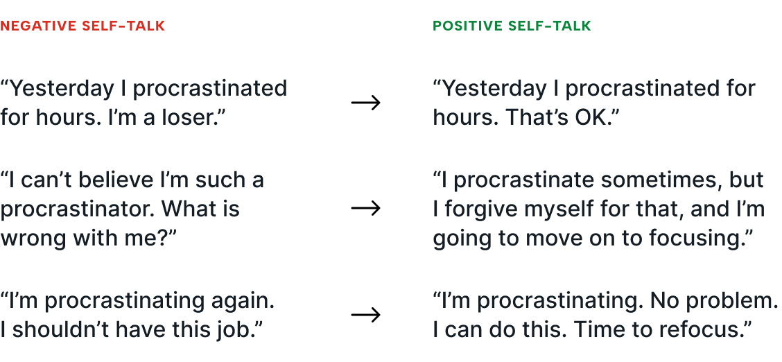 Then, to leverage the power of self-talk to reduce procrastination, turn your negative self-talk around a task to positive self-talk. Here are some examples of how you might do this: