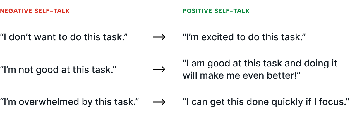 Or, you might tell yourself, “I’m excited to do this task, because I’ll learn and improve, and I’ll get closer to reaching my goals.” This is a form of positive self-talk.