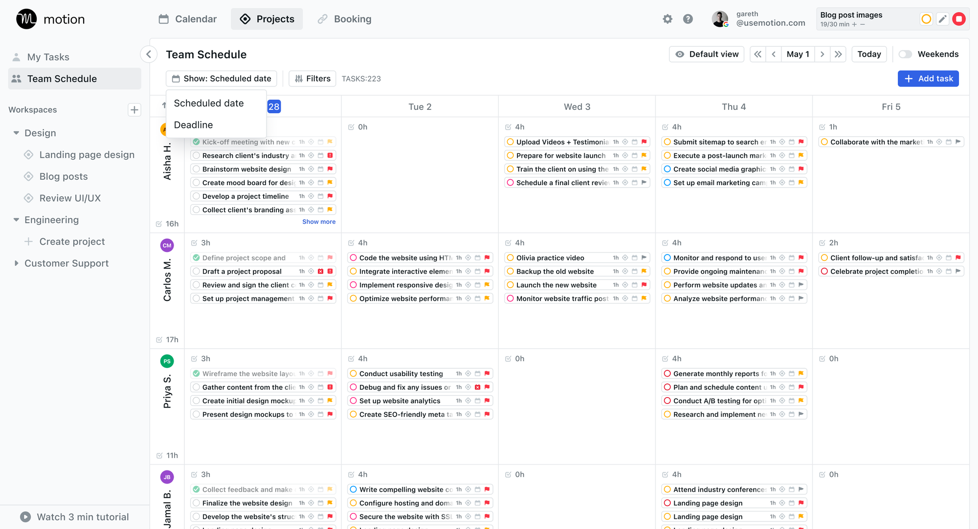 Staying on top of your team’s capacity is crucial. That’s why we display the number of task hours by the week and by the day, right where you need it. This includes both auto-scheduled and completed tasks, giving you a complete picture of your team's workload.